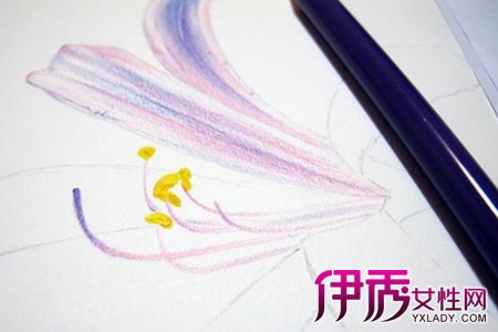 浅粉色勾边,留白的部分轻轻带下就好。大致分出花瓣的色块,把有粉色的区域勾出来,涂色。紫色覆盖,中间的部分颜色较重,但切忌别一下手就重涂,否则铅笔会结块。上普蓝色,根据照片加。第二片花瓣粉色勾边,画出颜色分区的纹路,然后由浅到深逐层加重。浅粉色画花丝,花丝根部和中部颜色较淡,轻勾一下就好。靠近花药的部分加重。