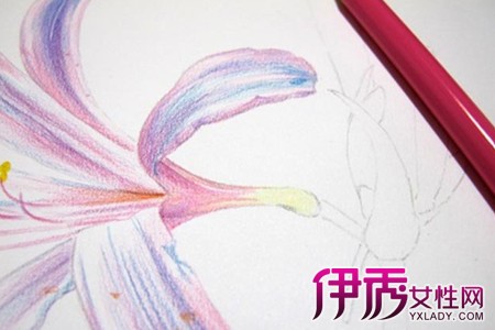 粉色勾边,并分出明暗区域,淡粉色把留白之外的地方都涂一遍,对颜色重的地方再进行局部加强。用深粉色加强。 PS:彩铅叠色的目的,就是使画面饱满、立体,一般最多叠3—4层就可达到想要的效果,倘若你叠了更多层,颜色依然不对,那恐怕是颜色选错了,拿起色卡对比,重选色吧。