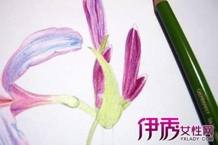 手绘彩铅画花卉绘画教程:紫红色(花骨朵的最后一层色)将花萼上的纹路勾一下,再把花梗的两侧线条和茎节的暗部加强一次。恩,我终于摆脱黑色了,勤劳的孩纸总是勇于做不同的尝试,虽然只是补个阴暗面而已。