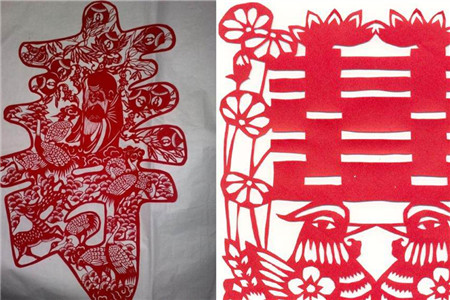 剪纸的表现形式是很丰富的,窗花带有喜字也可以剪出来,多么复杂的组合可难不倒这些手巧的艺人,我们要剪纸一般都需要在纸上画草图,但是这些剪纸艺术家是不需要的,他们拿起一张纸几分钟就可以剪出一幅作品,这是很令人佩服的,很多民间的老一辈剪纸艺术家甚至连字都不认识,但是他们剪出的字体却非常漂亮。