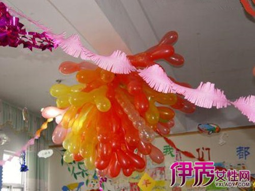 将各色气球串联挂屋顶,使整个房间便充满欢乐。气球颜色可以选择多一点,而后下面的绳子用细细的那种彩带,要很细,有风会飘的样子,然后把绳子弄长一点。气球放在屋顶的时候,可以采用胶粘也可以利用静电原理,在头发上摩擦,放在墙面上就粘住了。