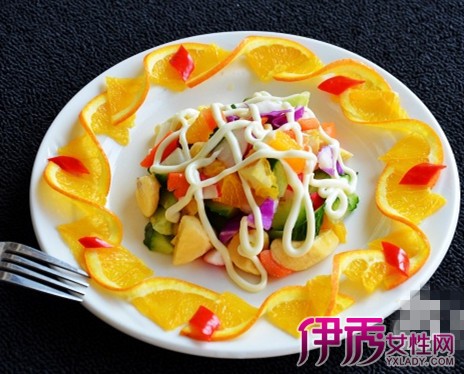 这是一款盘饰,以香橙为原料,切成薄片后简单地扭曲摆盘装饰,就可以给你视觉上的惊艳。比较适合沙拉或者水果蔬菜的装盘。非常好看。