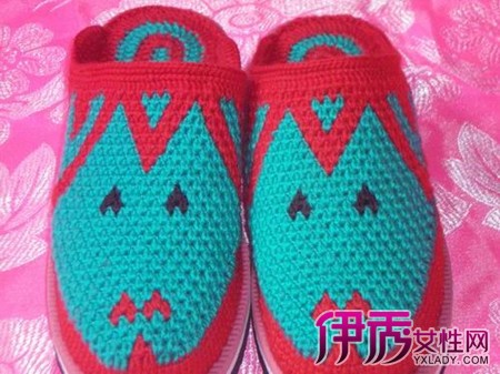 9.最后不加不减织得织30个来回收针,鞋面就完成了。弄完鞋面再看看鞋底,花样是一样的,您就按着鞋底的大小织吧,注意要比您买的鞋底稍稍小一点,因为毛线是个容易伸缩的东西。缝合的时候,您最好在鞋底下面添些什么东西。这样才更容易保暖。