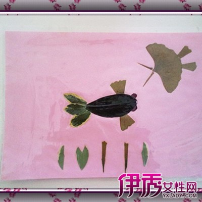 5把涂抹好胶水的树叶粘贴在纸上合适的位置,这个是金鱼的尾巴。