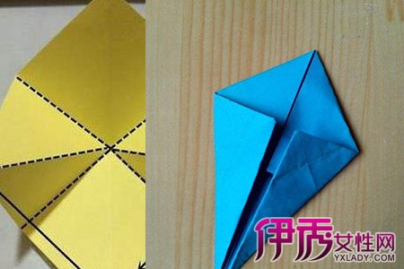 第一步:选择一张正方形的彩纸,沿着对角线折叠,翻转之后再沿着边对折。将折出来的边沿着三角形的中线对折到中间。