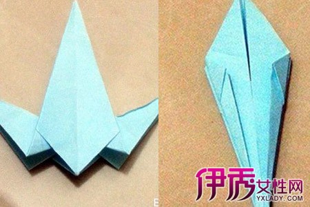 第四步:继续按着尾巴和中部不动,将左右两边的翅膀扯出来并压扁。将顶部向后折一下,再往前折,做出燕子的头部。