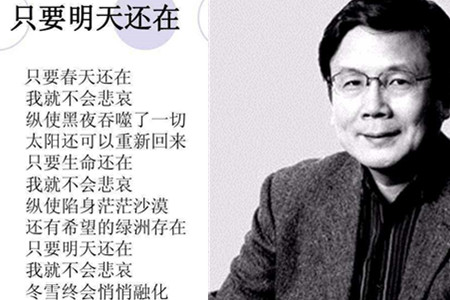 《只要明天还在》表达的就是这种面对困境一往无前的认真态度。无论在怎样的境遇面前,太阳都会照常升起,明天都会一直到来,也就有希望。而人只要心存希望,那么对生活也就有了信心,自身也有了努力的动力,而未来自然会铺展在自己面前。汪国真告诉我们,“只要春天还在,我就不会悲哀”。春天是鲜花盛开的季节,是希望遍野而生的时刻。