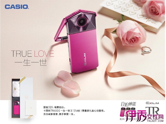 EX-TR600 520限量礼盒版由追求呈现女性理想之美肌拥有楔形超薄机身的卡西欧EX-TR600,与EX-TR600专属相机包和520告白卡片构成。卡西欧精密加工技术打造的追求女性自拍美学的EX-TR600 520限量礼盒版,以“TRUE LOVE一生一世”为主题,寓意礼物承载真爱赠予心爱的她。