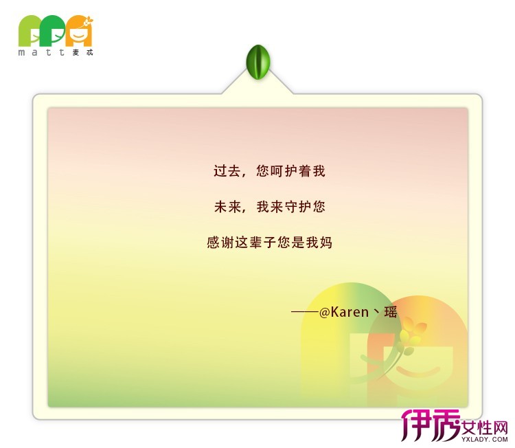 “过去,您呵护着我/未来,我来守护您/感谢这辈子您是我妈”,这是来自微博网友@karen瑶 的获奖作品,一份很温馨的三行情书表达自己对母亲的爱!