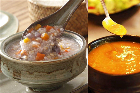 二、南瓜紫薯米糊。南瓜和紫薯颜色丰富,能培养宝宝对食物的兴趣;同时又富含纤维素,能够促进宝宝的消化。将南瓜、紫薯蒸熟后用勺子压成泥状,然后过筛,这是为了防止紫薯中的纤维卡到宝宝的嗓子,同时让口感更细腻。大米浸泡一夜后,放入豆浆机中打碎并煮熟,再加入南瓜泥和紫薯泥搅拌均匀。