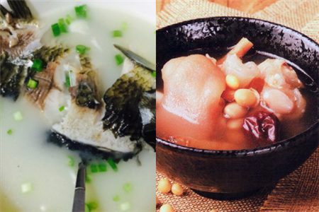 1、鲫鱼汤,将处理好的鲫鱼先下油锅煎至两面金黄,倒入开水炖煮,直至鱼肉软烂,汤水奶白即可。鲫鱼汤是传统下奶汤,利水通乳效果很好。