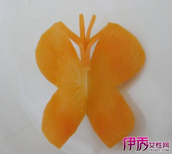 具体方法如图所示,做胡萝卜蝴蝶比做胡萝卜玫瑰花的难度要大,最难的两点是:两片翅膀要厚薄一样、适度 。如图:往里折蝴蝶头部的时候容易折断。可以把图,切的条的底部切掉一点点就容易折了主料:胡萝卜 (适量)、辅料厨具:其它分类:常见菜式 消暑解渴 健康食谱 素食 素菜 凉菜 其它 其他 半小时 普通难度胡萝卜选择粗壮些的,一把锋利的小刀。在胡萝卜头部匀称的地方,切下约10公分的段。胡萝卜段两面切直角。依照需要的大小斜切一刀,留下大的做蝴蝶。用刀沿着平面慢慢切约2毫米的薄片,底部留3-5毫米不要切透。切完第一刀后,切第二张薄片,也是2毫米,一切到底。切成如图的样子。在胡萝卜片的直角出切下个等腰三角。如图,斜着切一刀,成蝴蝶的触角。慢慢打开。在图示的位置切开。