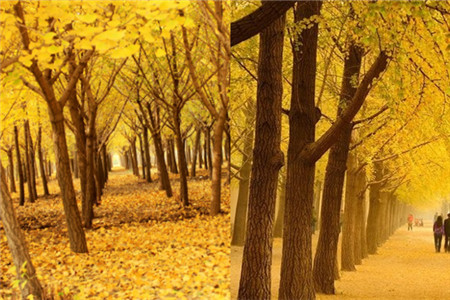 每年的11月份就是银杏树叶变黄的时候,在这期间,银杏树叶从充满生机的绿色慢慢的转变成黄色,这时候是观赏银杏树较合适的时间,你会看到大片大片的树木呈现出金黄色,掉落在地上的叶子铺满了一路,从远处看就像是在地上散满了金色的粉末;在即将进入寒冬之际,那一片金黄色会让你产生一种错觉,带给你一丝太阳的温暖。