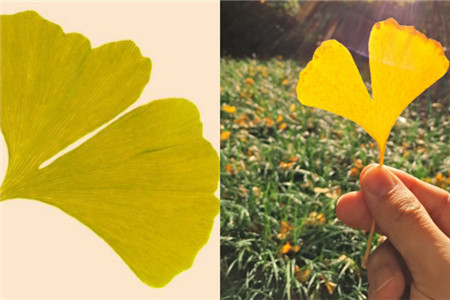 银杏树叶和普通的树叶形状不一样,它是一个扇形,叶子的边缘不是平滑的,是上下起伏的,就像是海面刮起大浪水不断起伏,中间的部分比两边凹入得深些;一片片飘落的银杏树叶就像是金黄色的蝴蝶随风飞舞;还有人说每一片飘落的银杏叶就像是美人鱼的尾巴,里面藏满了对爱人的思念。