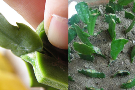 一般我们会使用仙人掌为底座来进行蟹爪兰的扦插,因为相比之下,仙人掌的生根速度更快。具体做法是取一块较大的仙人掌,在中间切开一个口子,再把蟹爪兰的切口部分插进口子里,用手轻轻捏压一下让其固定。插好之后再把整个部分都插入准备好的土壤中,并小铲子按压下周围的土壤使其固定。