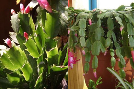 蟹爪兰,在外形上与仙人指相似,但是蟹爪兰的叶子没有刺,而且整体呈悬垂状态,分枝也有很多,扁平枝叶,肉质饱满,每一小节有明显的锯齿状,顶端开花,颜色单一,只有玫瑰红色,大约每年的10月份开花。与仙人指相比,比较明显的区别在于锯齿的形状,仙人指的锯齿是平滑的,而蟹爪兰的叶子有凸出的锯齿状。