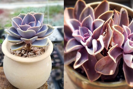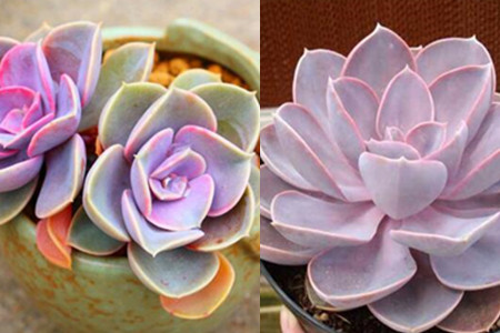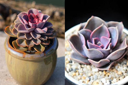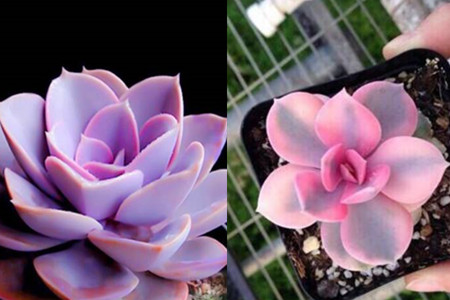 紫珍珠,并不是一开始就有的品种,它其实是由粉彩莲和星影这两种多肉植物杂交而得来的,紫珍珠的叶片比较宽,像我们吃饭的小茶匙一般,叶片的边缘向内轻轻卷起,表面较为光滑,没有粗糙的纹理。紫珍珠的叶片从下往上叠起,排列形状类似莲花宝座,下面叶片宽厚且大,越向上越小。在阳光的照耀下,呈现出漂亮的粉紫色。