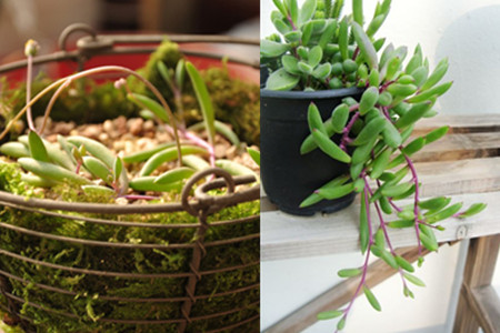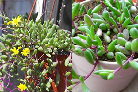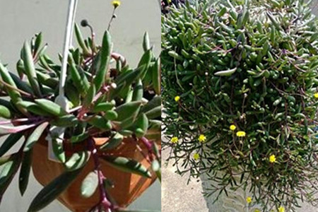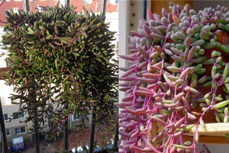 紫玄月是多肉植物的一种,但是它与大多的多肉植物不同,还同时具备了吊兰的特色。它的枝茎是匍匐延长的,可以像吊兰一样长长地垂下来,一条条的象紫色的瀑布。