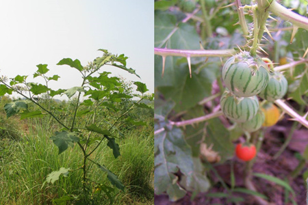 2.“带刺的颠茄”。作为一个土生土长的南方人,小时候经常会摘一像小西瓜一样的果实玩儿,不过这种果实采摘起来有一定的难度,因为它叶子的表面有很多刺,密密麻麻的,看起来让人头皮发麻。不过童年时候的我们还是会勇敢地去采摘,随着年纪逐渐增大之后,才知道这种植物是颠茄,有一定的药用价值。