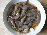 3 葱姜、料酒浸泡虾5分钟,中途翻动几次,使之均匀浸渍调料。