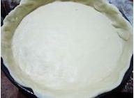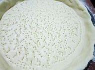 7.披萨盘周围抹上一层油,将面团擀成比披萨盘大一圈的面饼,放入披萨盘中。