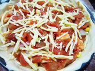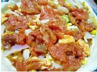 11.将准备好的熟玉米粒的一半、瘦肉、洋葱均匀的铺在上面。
