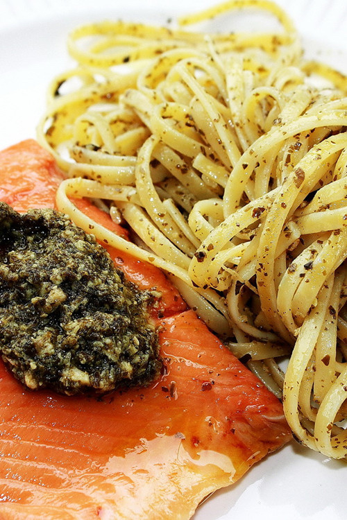 3 把烤好的鱼柳抹青酱置于面上用橙肉及香草装饰即可。
