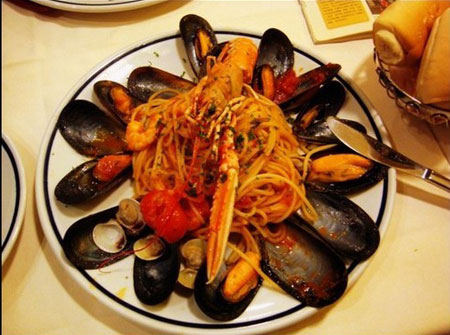 4 烧热橄榄油倒人所有蔬菜炒软,最后放煮好的贝壳而和高汤调味,淋奶油芝士撒帕玛臣芝士粉在焗炉上焗上颜色用法香碎装饰。