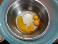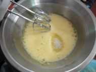 3.鸡蛋打至粗泡,加入白糖,分3次。