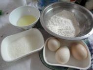 1.鸡蛋3个 糖60克 玉米油20ml 低筋面粉90克。