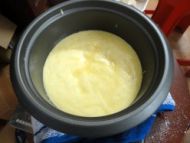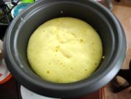 11.把蛋糕糊倒入电饭锅,抓住边缘水平向下震几下电饭锅胆,把表面的大气泡震破。