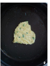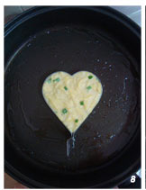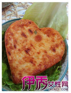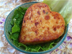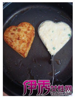 8 把搅拌好的土豆液放入心型模具里压实,小火煎制。