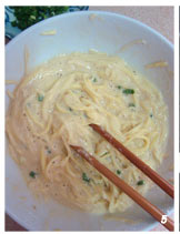 4 加入面粉、盐和葱花,然后放入少量的水拌匀。