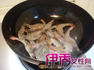 5 油热后放入腌制好的虾。