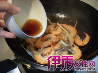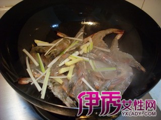 6 待虾的一面变红后放入葱姜丝,然后翻面。