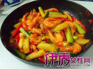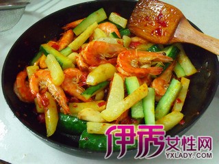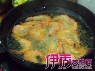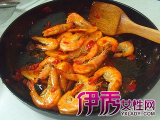6 放入虾,烹入一汤匙料酒,一茶匙糖,半碗高汤翻炒均匀稍微煨三分钟。