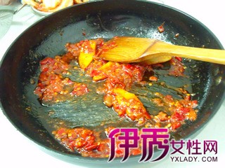 5 锅里的油全部倒掉,剩下的油小火把郫县豆瓣和剁椒炒和油完全融合,放入姜片炒匀。