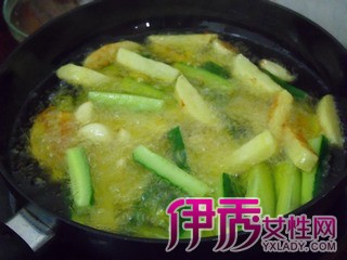 3 油锅先把土豆炸微黄,下入黄瓜和蒜子,炸一下,捞出,大火烧油复炸一次吐油。