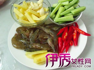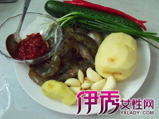 主料:鲜基围虾(一斤)、土豆(一个)、黄瓜(一根)、红椒(两个)
