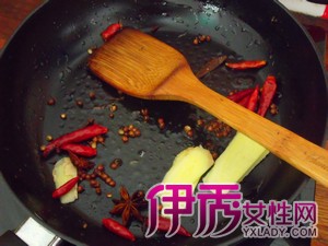 6 锅里的油全部倒掉,把花椒和辣椒,八角丁香,小火烘出香味。
