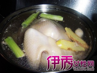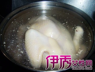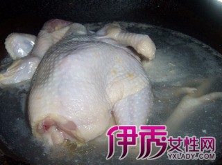 4 锅置火上加入适量水、料酒烧开下入鸡焯去血沫捞出备用。