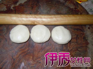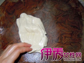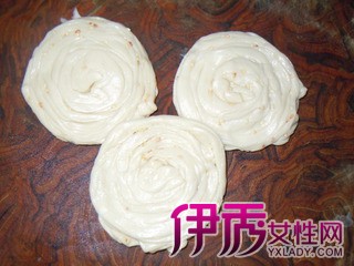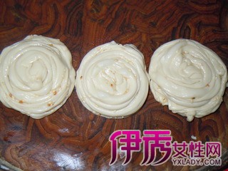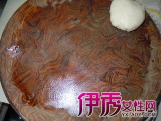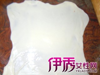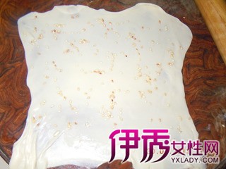 10 用擀面杖把面团擀薄 擀匀。 薄面皮再撒上葱油。