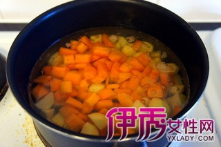 3 将胡萝卜土豆放入水中煮,直至煮开,再加入一碗水煮开。(如果喜欢吃比较软的土豆可以随后再多加入一碗水,直至煮开)。