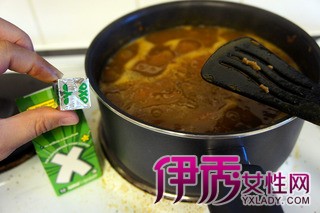 6 加入秘密武器,牛肉汤浓缩块,让咖喱和肉块味道更浓郁。(同款也有鸡肉汤浓缩块)中火熬煮。