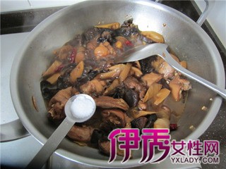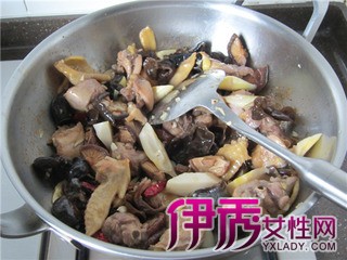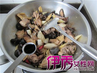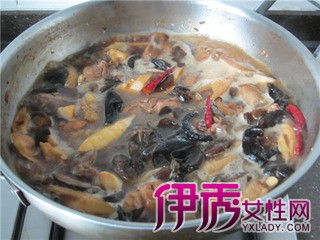 14 加入加热过的香菇水,没过鸡肉;如果香菇水不够,可以再加点儿开水;大火煮开后转小火,盖上锅盖焖炖至鸡肉熟烂,中间检查并翻炒;