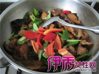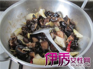 11 下入木耳、香菇、笋,转大火,翻炒均匀;