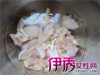 4 鸡肉剁成核桃块儿,提前清水浸泡,中间多次换水,至水清;