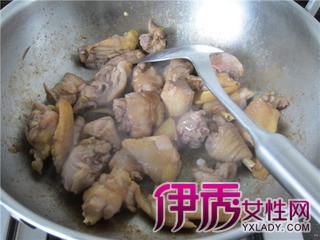 9 锅中入油,热锅凉油小火,加入鸡肉块儿以及所有腌料,慢慢煸炒至鸡肉出油、表面金黄,盛出备用;