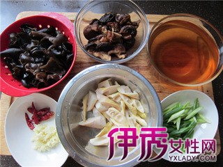 调料:水发冬笋(100g)干香菇(10朵)木耳(10g)青红尖椒(共1个)香葱1根(适量)干红辣椒(5、6个)大蒜(2瓣)盐(1/2小勺)冰糖(1小勺)老抽,(1/2小勺)香菇水(适量)食用油(2大勺)厨具炒锅