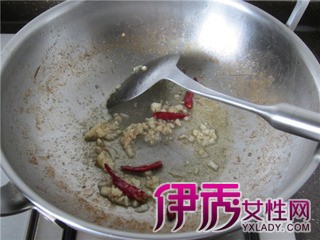 10 原锅爆香蒜末和干红辣椒,至辣椒呈深枣红色;